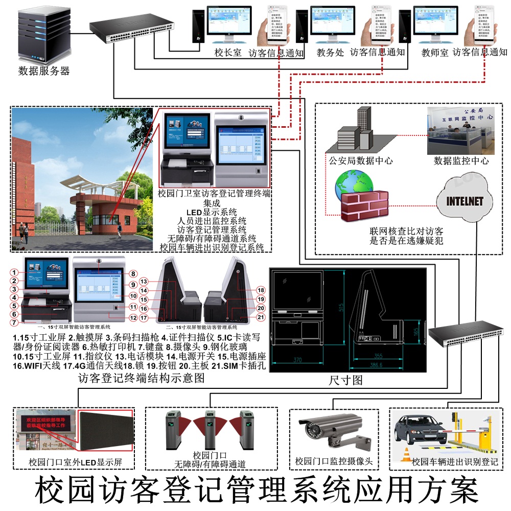 校門口LED顯示系統(tǒng):LED屏直接經(jīng)過交換機與訪客機終端相連,由訪客登記管理系控制用來發(fā)布學校信息通知,顯示人員進出信息和快遞包裹信件信息,LED的尺寸及顯示模式參數(shù)由客戶選定。