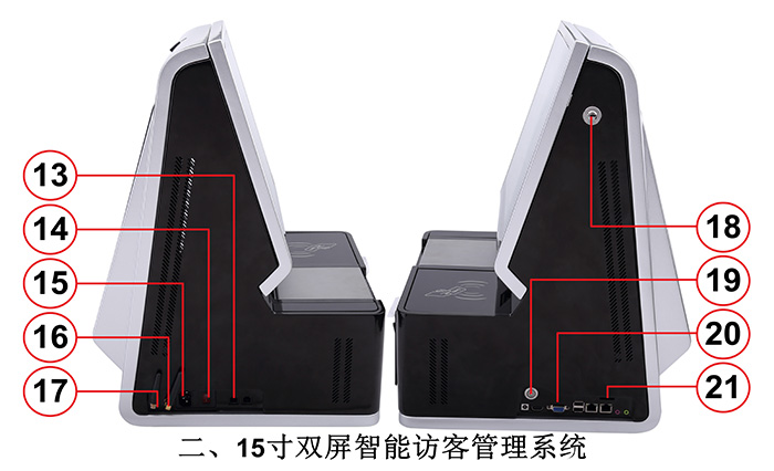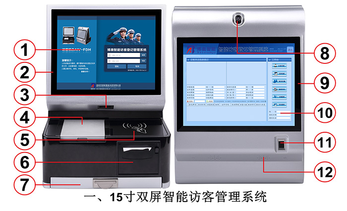 15寸雙屏智能訪客登記管理一體機集成工控主板,液晶屏,電容觸摸屏,鍵盤,證件掃描采集儀,身份證閱讀器,IC卡發(fā)卡器/讀卡器,指紋儀,條碼掃描儀,熱敏打印機,攝像頭,電話模塊,喇叭等,15寸雙屏智能訪客機是由博奧智能科技有限公司研發(fā)生產(chǎn)的一款高科智能訪客登記管理終端,采用15寸工業(yè)液晶屏,前后雙屏,主板自主研發(fā),X86結(jié)構(gòu),板載Intel第四代Hasswall和第五代Broadwell平臺CPU,客戶行選定,板載4G/8G內(nèi)存,客戶也可自行選定內(nèi)存大小 ,板載WIFI藍(lán)牙模塊及大功率功放模塊,固態(tài)硬盤存儲;設(shè)備外殼采用鈑金材料,表面精工打磨,烤漆清油等處理工藝,防銹、耐磨;它具有結(jié)構(gòu)合理,操作簡便,速度快,運行穩(wěn)定,性能可靠,功能強大,集成度高,適用領(lǐng)域廣;外觀精美、造型獨特,款式新穎,色澤光潤、質(zhì)感一流等特點。