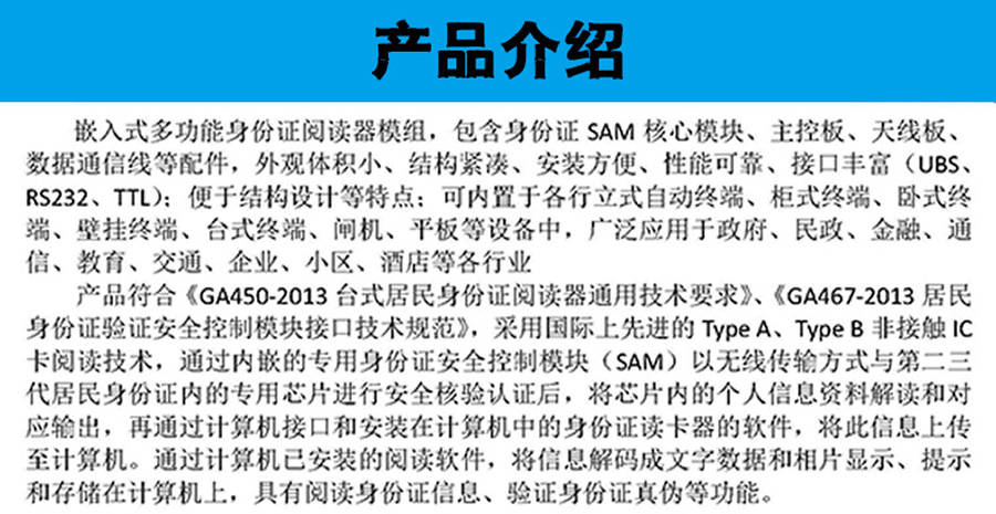 嵌入式多功能身份證閱讀器模組,包含身份證SAM核心模塊、主控板、天線板、數(shù)據(jù)通信線等配件,外觀體積小、結(jié)構(gòu)緊湊、安裝方便、性能可靠、接口豐富(UBS、RS232、TTL);便于結(jié)構(gòu)設(shè)計(jì)等特點(diǎn);可內(nèi)置于各行立式自動(dòng)終端、柜式終端、臥式終端、壁掛終端、臺(tái)式終端、閘機(jī)、平板等設(shè)備中,廣泛應(yīng)用于政府、民政、金融、通信、教育、交通、企業(yè)、小區(qū)、酒店等各行業(yè)