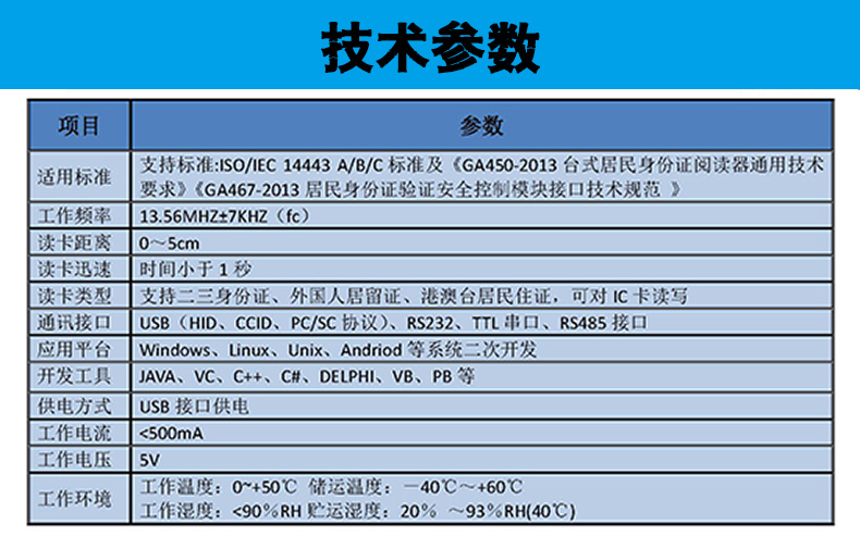 支持標(biāo)準(zhǔn):ISO/IEC 14443 A/B/C標(biāo)準(zhǔn)及《GA450-2013臺(tái)式居民身份證閱讀器通用技術(shù)要求》《GA467-2013居民身份證驗(yàn)證安全控制模塊接口技術(shù)規(guī)范 》