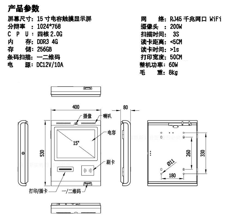 屏幕尺寸:15寸電容觸摸顯示屏?