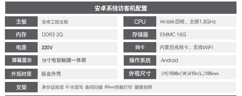?? ? ?15寸立式訪客機整機采用流線性設(shè)計,符合人體工程原理,結(jié)構(gòu)合理,外形美觀大方,操作簡單,維護方便;集成身份證閱讀 、IC卡讀寫、 條碼掃描、 80mm熱敏打印、 攝像拍照、 多種證件OCR識別掃描(選配)功能,支持安卓和Windows系統(tǒng) ;產(chǎn)品主要用于政府機關(guān)、軍隊、公安、法院、學校、事業(yè)單位、花園小區(qū)、高檔寫字樓、工廠等場所的門衛(wèi)傳達室對進出人員信息化登記人證核驗,從而代替了傳統(tǒng)的手工登記,有效的提高了門衛(wèi)管理工作效率及證件信息登記準確性,給日后的信息查詢工作更方便量更快捷。