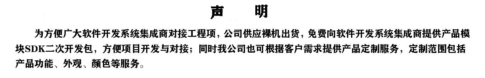 ? ? ? ? ??為方便廣大軟件開發(fā)系統(tǒng)集成商對接工程項,公司供應(yīng)裸機出貨,免費向軟件開發(fā)系統(tǒng)集成商提供產(chǎn)品模塊SDK二次開發(fā)包,方便項目開發(fā)與對接;同時我公司也可根據(jù)客戶需求提供產(chǎn)品定制服務(wù),定制范圍包括產(chǎn)品功能、外觀、顏色等服務(wù)。