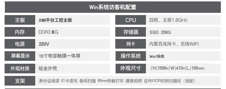 功能配置:身份證閱讀 IC卡讀寫 條碼掃描 80mm熱敏打印 攝像拍照 多種證件OCR識別掃描(選配)