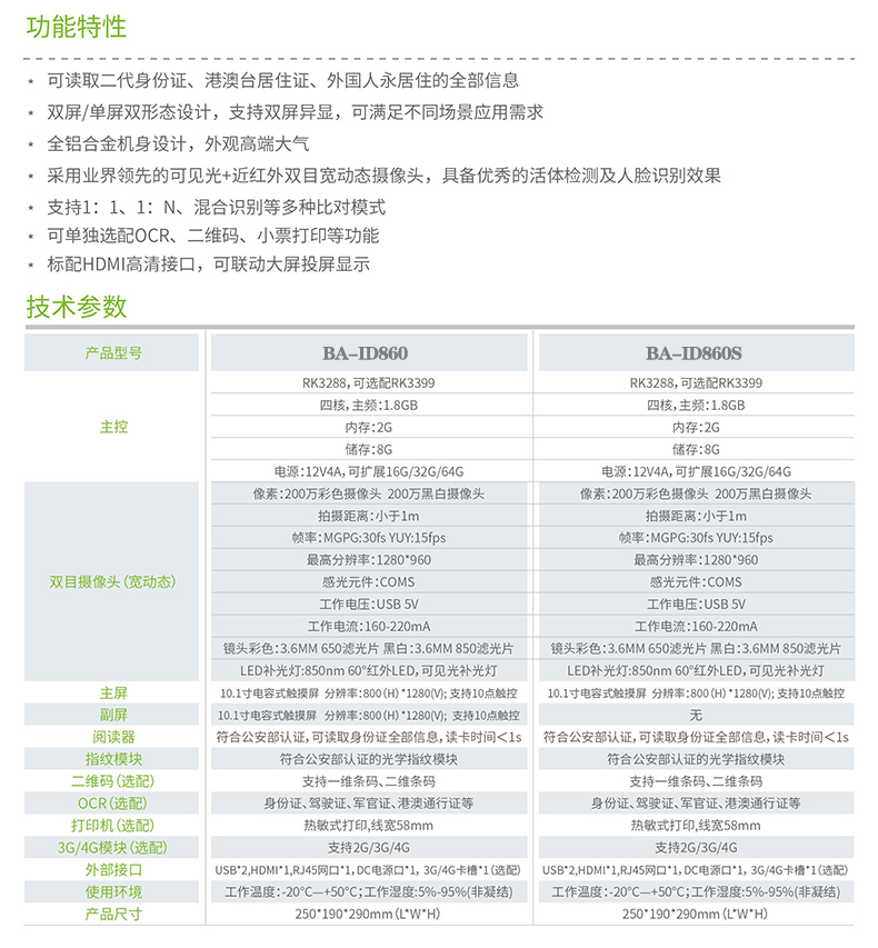 BA-ID860是一款基于Android安卓系統(tǒng)的桌面式雙屏多功能人證核驗訪客機終端,該產(chǎn)品集二代證閱讀、指紋比對、人臉比對等核驗功能于一體;支持雙屏顯示、二維碼掃描、OCR證件識別、58式小票打印等功能,外觀精美小巧,采用雙1 0.1 英寸高清電容操作屏,可隨意放置于桌面,滿足不同行業(yè)用戶的人證核驗需求,適用于各行業(yè)領(lǐng)域。