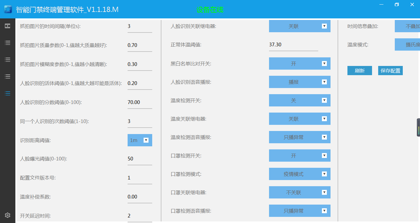 ???用戶可設(shè)置人臉抓拍的關(guān)鍵參數(shù)和開關(guān)設(shè)備功能。設(shè)備支持人臉識別比對、體溫檢測、口罩檢測三大功能,用戶可自由組合配置開關(guān)功能,是否關(guān)聯(lián)控制繼電器,是否播報語音提醒等。例如用戶要求體溫正常即可開門,則開啟體溫檢測功能,其余關(guān)閉即可實現(xiàn);若用戶要求規(guī)定的人,體溫正常且佩戴口罩后才可以開門,則必須同時開啟人臉識別比對、體溫檢測、口罩檢測,當(dāng)此三項全部檢測正常才會控制繼電器開門。配置界面和具體詳細(xì)如下所述。