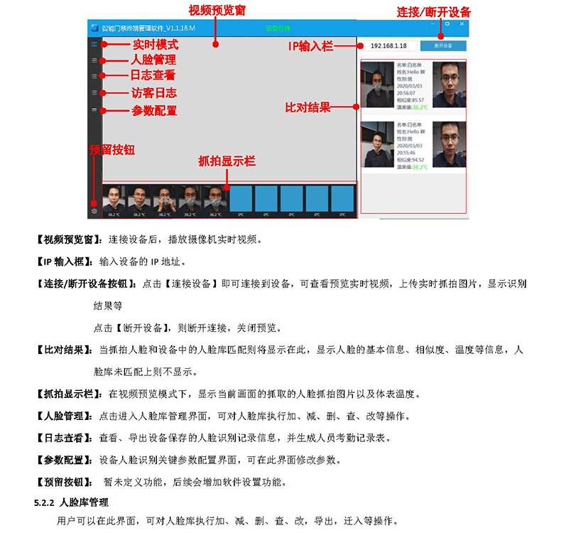 設(shè)備上電后,使用智能門禁管理軟件設(shè)置人臉庫、預(yù)覽實時視頻、顯示實時對比結(jié)果、讀取設(shè)備日志、配置設(shè)備參數(shù)等操作。