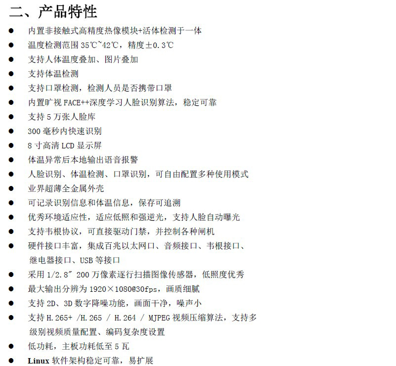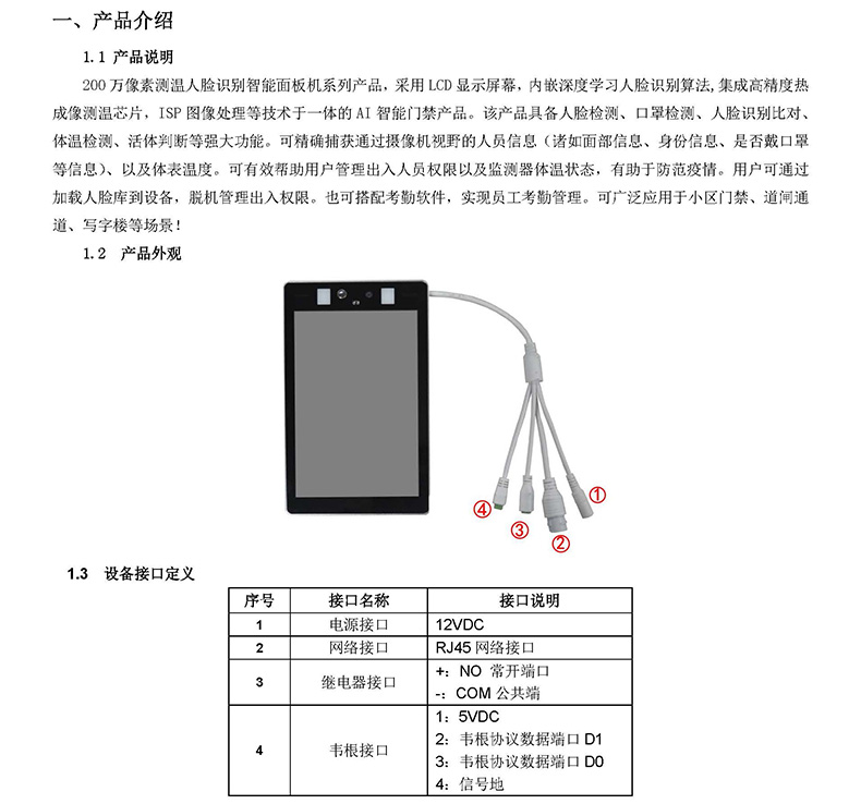 200萬像素測溫人臉識別智能面板機系列產(chǎn)品,采用LCD顯示屏幕,內(nèi)嵌深度學(xué)習(xí)人臉識別算法,集成高精度熱成像測溫芯片,ISP圖像處理等技術(shù)于一體的AI智能門禁產(chǎn)品。該產(chǎn)品具備人臉檢測、口罩檢測、人臉識別比對、體溫檢測、活體判斷等強大功能。可精確捕獲通過攝像機視野的人員信息(諸如面部信息、身份信息、是否戴口罩等信息)、以及體表溫度??捎行椭脩艄芾沓鋈肴藛T權(quán)限以及監(jiān)測器體溫狀態(tài),有助于防范疫情。用戶可通過加載人臉庫到設(shè)備,脫機管理出入權(quán)限。也可搭配考勤軟件,實現(xiàn)員工考勤管理??蓮V泛應(yīng)用于小區(qū)門禁、道閘通道、寫字樓等場景!