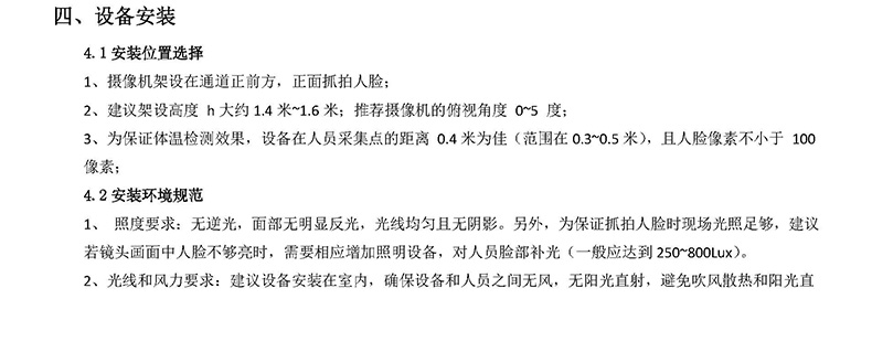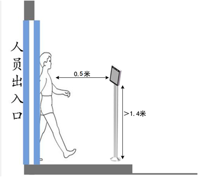 3、為保證體溫檢測效果,設(shè)備在人員采集點的距離 0.4米為佳(范圍在0.3~0.5米),且人臉像素不小于 100像素;