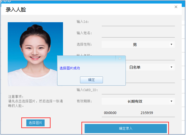 點擊【單個導(dǎo)入】,彈出錄入人臉界面è點擊【選擇圖片】,選取人臉圖片文件è輸入人員信息è點擊【確定錄入】即可完成單個人臉導(dǎo)入。