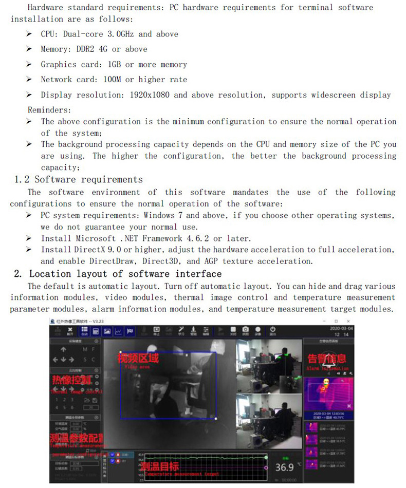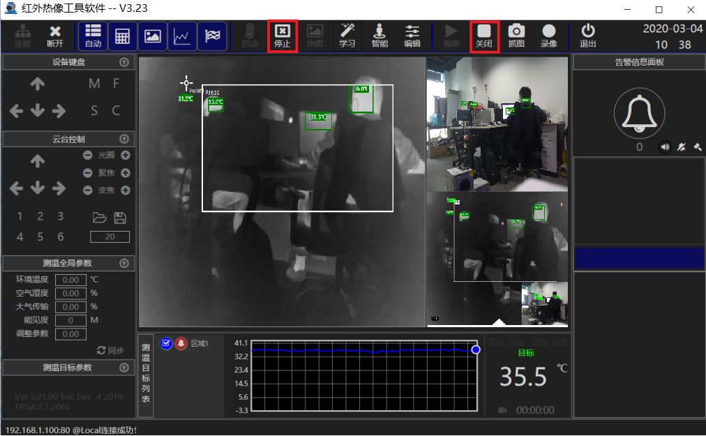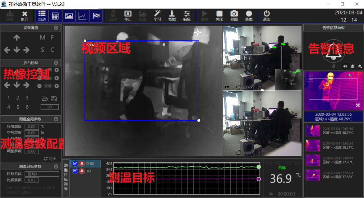 博奧智能熱像儀通過網(wǎng)絡連接PC,PC端安裝軟件,該軟件可以連接熱像視頻,可以顯示最高溫,中心點溫度;可以設置區(qū)域,自動追蹤人員并顯示溫度,可配置超溫報警,實現(xiàn)報警抓拍功能,支持通過AV視頻接口連接大屏顯示器。