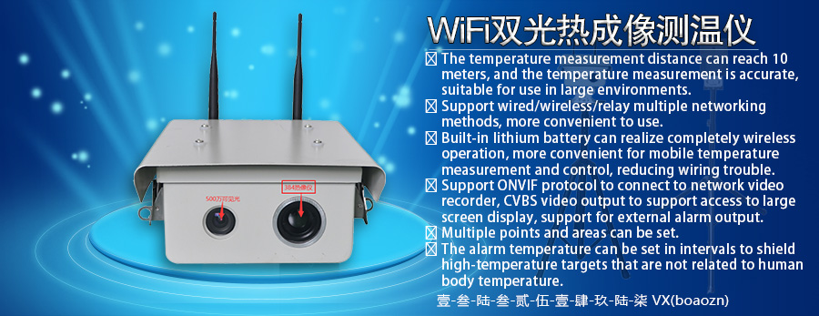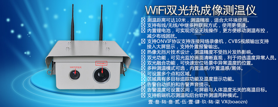 無線雙光融合人體高精度測溫儀,具有雙光融合功能,可快速準確地分辨溫度異常人員,可輸出無線/有線網(wǎng)絡信號,配合后臺PC測溫軟件,可實現(xiàn)非接觸快速大流量人體溫度異常篩選功能,采用最新智能測溫模型,無擋片成像方式,可以連續(xù)不間斷對目標人群進行溫度檢測,測溫精度可達±0.3°(配置黑體可達±0.1°-0.3°)。