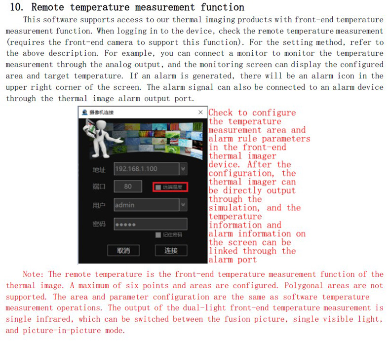 注:遠端溫度就是熱像前端測溫功能,最多配置總共六個點和區(qū)域,不支持多邊形區(qū)域,區(qū)域和參數(shù)配置和軟件測溫操作一樣。雙光前端測溫的輸出是單紅外,融合畫面、單可見光、畫中畫模式可切換的。