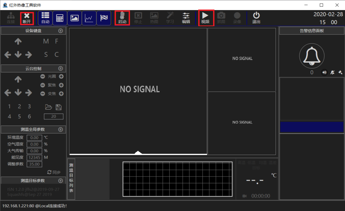 連接成功后,可看到“斷開”變亮,首先點擊“視頻”,打開視頻,然后打開“啟動”,啟動測溫功能。