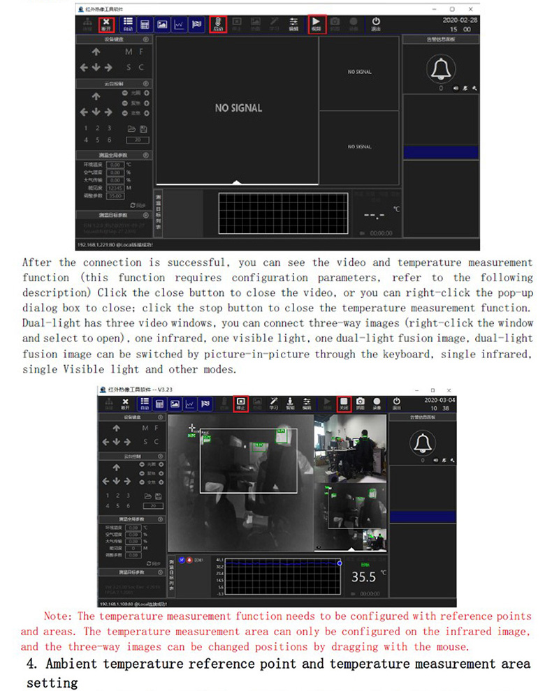 ??? 雙光模組通過網(wǎng)絡圖傳連接PC,PC端安裝測溫軟件,該軟件可以連接熱像和可見光視頻,可以設置點和區(qū)域測溫,區(qū)域內可自動追蹤人員并顯示溫度,可配置超溫報警,實現(xiàn)報警抓拍功能。