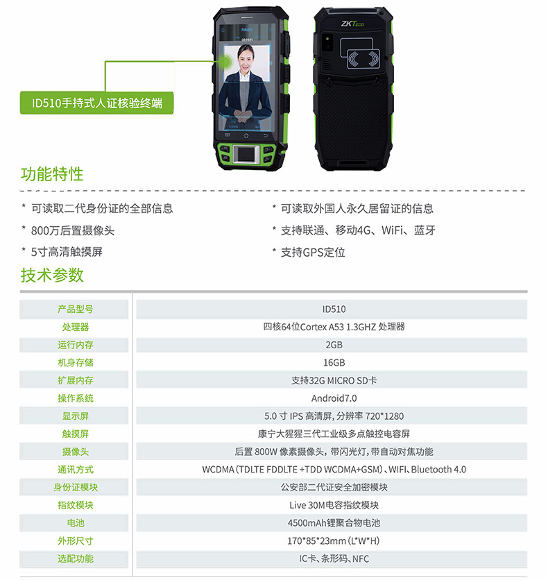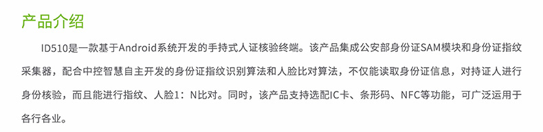博奧智能ID510是—款基于Android系統(tǒng)開發(fā)的手持式人證核驗(yàn)終端。該產(chǎn)品集成公安部身份證SAM模塊和身份證指紋采集器,配合中控智慧自主開發(fā)的身份證指紋識別算法和人臉比對算法,不僅能讀取身份證信息,對持證人進(jìn)行身份核驗(yàn),而且能進(jìn)行指紋、人臉1: N比對。同時(shí)該產(chǎn)品支持選配IC卡、條形碼、NFC等功能,可廣泛運(yùn)用于各行各業(yè)。