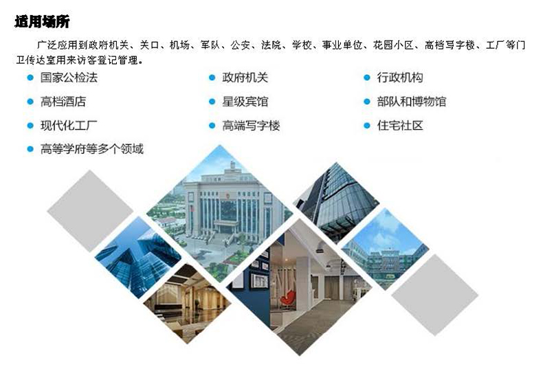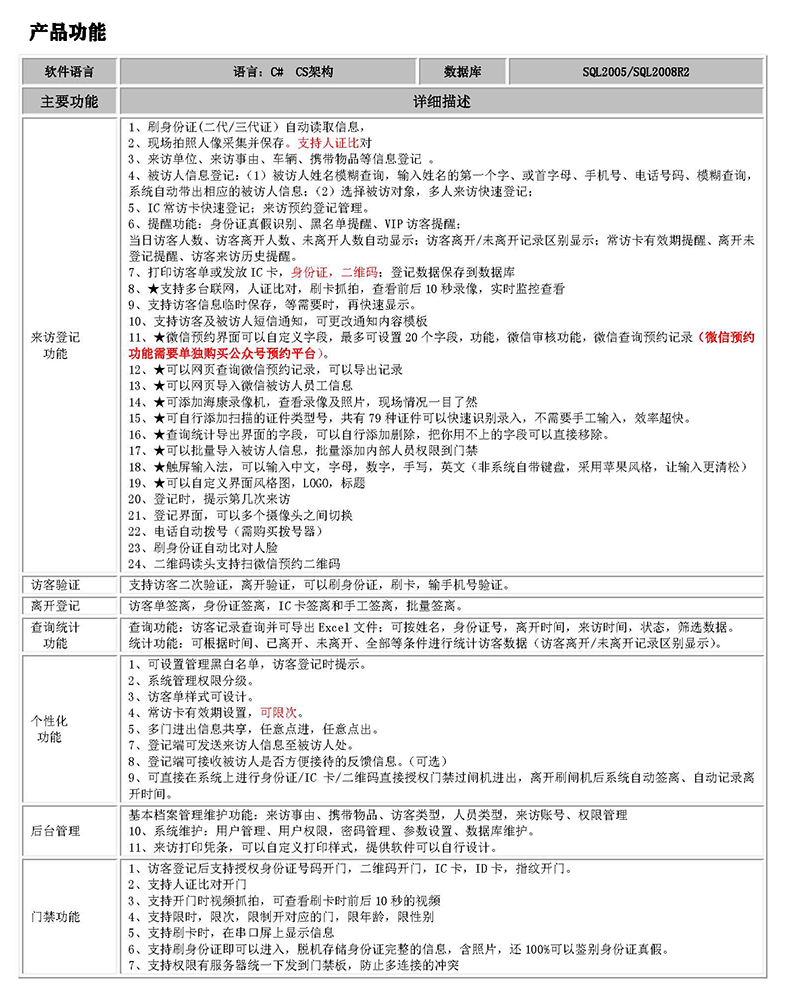1、刷身份證(二代/三代證)自動(dòng)讀取信息, 2、現(xiàn)場(chǎng)拍照人像采集并保存。支持人證比對(duì) 3、來訪單位、來訪事由、車輛、攜帶物品等信息登記 。 4、被訪人信息登記:(1)被訪人姓名模糊查詢,輸入姓名的第一個(gè)字、或首字母、手機(jī)號(hào)、電話號(hào)碼、模糊查詢,系統(tǒng)自動(dòng)帶出相應(yīng)的被訪人信息;(2)選擇被訪對(duì)象,多人來訪快速登記; 5、IC常訪卡快速登記;來訪預(yù)約登記管理。 6、提醒功能:身份證真假識(shí)別、黑名單提醒、VIP訪客提醒; 當(dāng)日訪客人數(shù)、訪客離開人數(shù)、未離開人數(shù)自動(dòng)顯示;訪客離開/未離開記錄區(qū)別顯示;常訪卡有效期提醒、離開未登記提醒、訪客來訪歷史提醒。 7、打印訪客單或發(fā)放IC卡,身份證,二維碼;登記數(shù)據(jù)保存到數(shù)據(jù)庫 8、★支持多臺(tái)聯(lián)網(wǎng),人證比對(duì),刷卡抓拍,查看前后10秒錄像,實(shí)時(shí)監(jiān)控查看 9、支持訪客信息臨時(shí)保存,等需要時(shí),再快速顯示。 10、支持訪客及被訪人短信通知,可更改通知內(nèi)容模板 11、★微信預(yù)約界面可以自定義字段,最多可設(shè)置20個(gè)字段,功能,微信審核功能,微信查詢預(yù)約記錄(微信預(yù)約功能需要單獨(dú)購買公眾號(hào)預(yù)約平臺(tái))。 12、★可以網(wǎng)頁查詢微信預(yù)約記錄,可以導(dǎo)出記錄 13、★可以網(wǎng)頁導(dǎo)入微信被訪人員工信息 14、★可添加海康錄像機(jī),查看錄像及照片,現(xiàn)場(chǎng)情況一目了然 15、★可自行添加掃描的證件類型號(hào),共有79種證件可以快速識(shí)別錄入,不需要手工輸入,效率超快。 16、★查詢統(tǒng)計(jì)導(dǎo)出界面的字段,可以自行添加刪除,把你用不上的字段可以直接移除。 17、★可以批量導(dǎo)入被訪人信息,批量添加內(nèi)部人員權(quán)限到門禁 18、★觸屏輸入法,可以輸入中文,字母,數(shù)字,手寫,英文(非系統(tǒng)自帶鍵盤,采用蘋果風(fēng)格,讓輸入更清松) 19、★可以自定義界面風(fēng)格圖,LOGO,標(biāo)題 20、登記時(shí),提示第幾次來訪 21、登記界面,可以多個(gè)攝像頭之間切換 22、電話自動(dòng)撥號(hào)(需購買撥號(hào)器) 23、刷身份證自動(dòng)比對(duì)人臉 24、二維碼讀頭支持掃微信預(yù)約二維碼 |