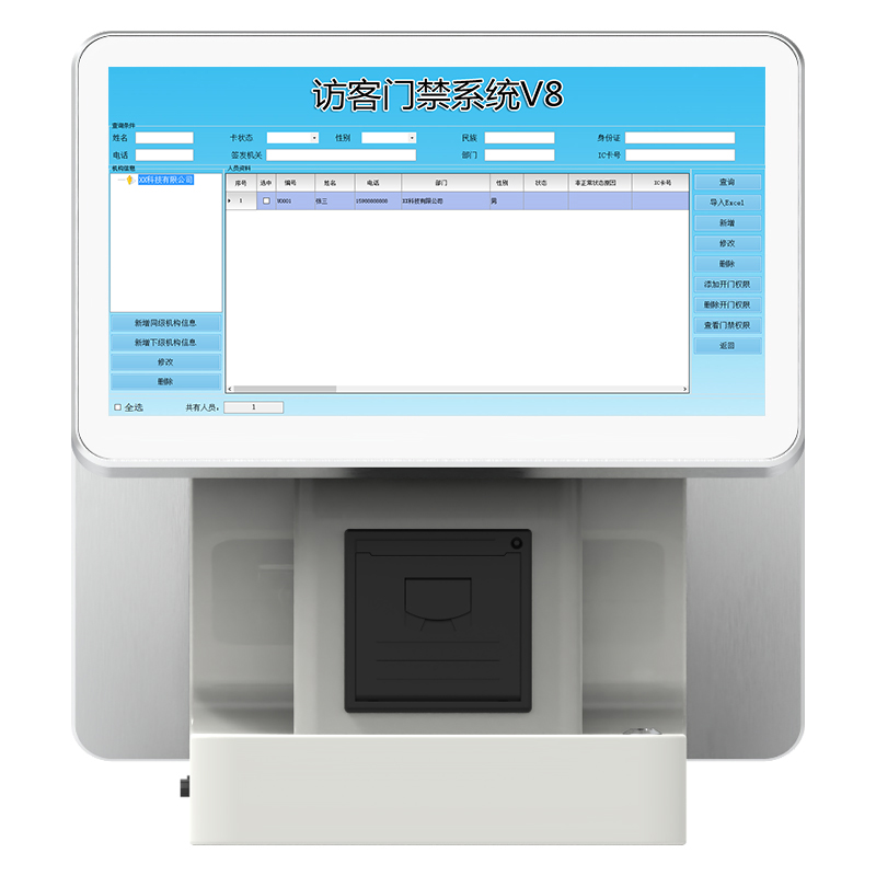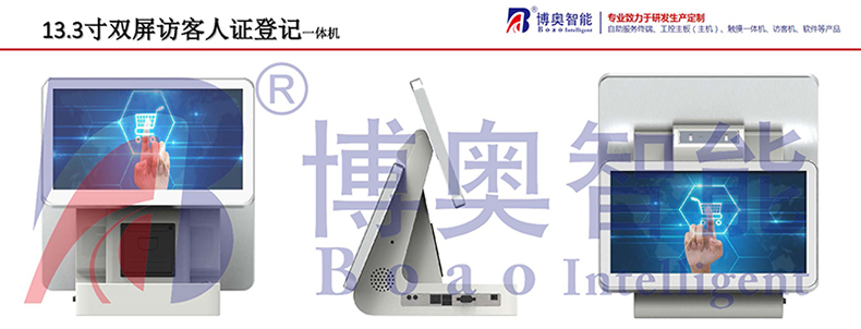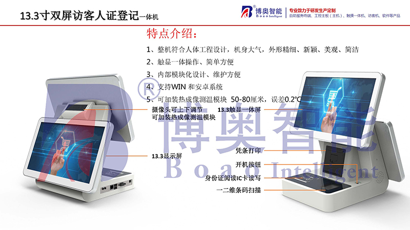 BA-FK13A訪客機(jī)是博奧智能針對(duì)政府機(jī)關(guān)、軍隊(duì)、公安、法院、學(xué)校、事業(yè)單位、花園小區(qū)、高檔寫字樓、工廠等門衛(wèi)傳達(dá)室設(shè)計(jì)加工的一款進(jìn)出人員信息化登記設(shè)備, 從而代替了傳統(tǒng)的手工登記,有效的提高了門衛(wèi)管理工作效率及證件信息登記準(zhǔn)確性, 為日后的信息查詢工作更方便量更快捷。整機(jī)采用流線性設(shè)計(jì),符合人體工程原理,結(jié)構(gòu)合理,外形美觀大方,操作簡單,維護(hù)方便;內(nèi)部采用模塊化設(shè)計(jì),集成13.3寸電容觸顯一體屏和13.3寸液晶屏、身份證閱讀器,IC卡讀寫器、雙目寬動(dòng)態(tài)高清攝像頭、條碼掃描儀、熱敏打印機(jī)及熱成像測(cè)溫等模塊。