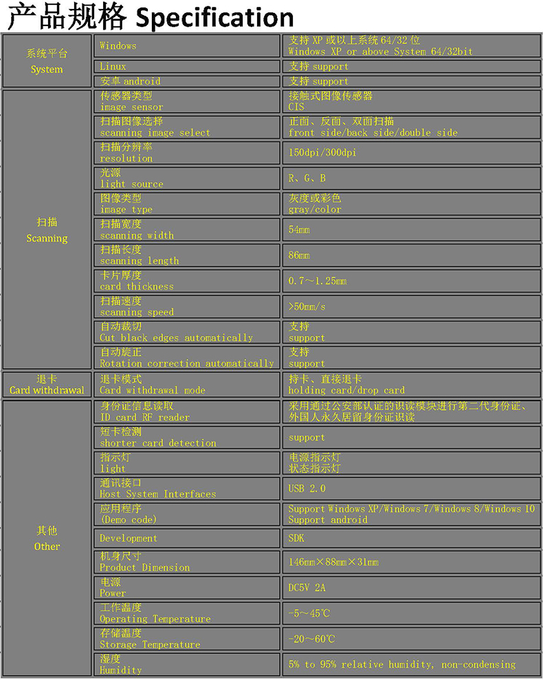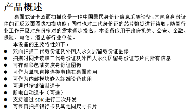 桌面式證卡雙面掃描儀是一種中國(guó)居民身份證信息采集設(shè)備,其包含身份證件的正反雙面圖像掃描功能;同時(shí)也對(duì)二代身份證的芯片數(shù)據(jù)進(jìn)行讀取。隨著行業(yè)工作開(kāi)展對(duì)身份核對(duì)的需求逐步提高,本設(shè)備應(yīng)用于政府機(jī)關(guān)、公安、金融、保險(xiǎn)、電信、酒店等行業(yè)單位。