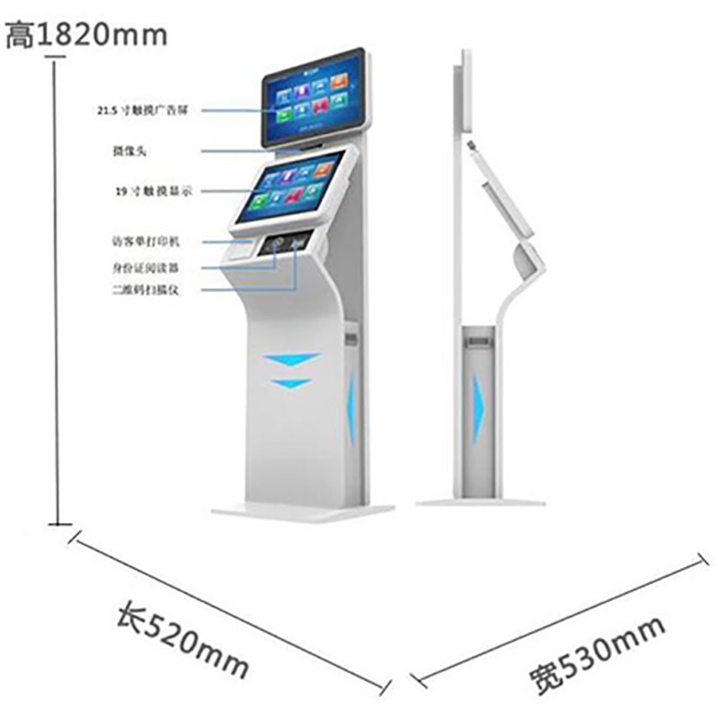 博奧智能雙屏訪客自助登記一體機外形美觀大方,結(jié)構(gòu)合理,外殼采用鈑金材質(zhì)烤漆工藝;集成21.5寸廣告屏和19寸用戶操作屏,身份證閱讀器,打印機等模塊,主要用于來訪人員進出登記。