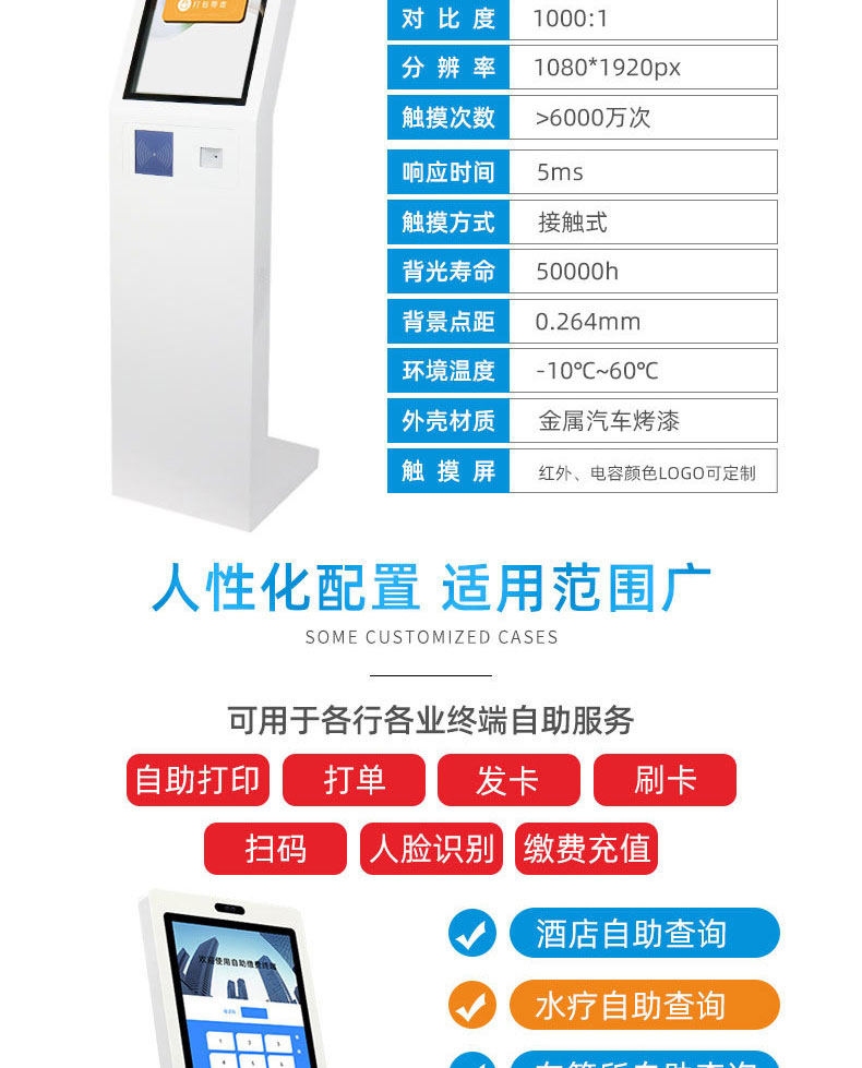 供電腦觸控產(chǎn)品、自助服務(wù)終端的設(shè)計(jì)及生產(chǎn)服務(wù),主要產(chǎn)品自助終端機(jī)、自助打印機(jī)、自助取票機(jī)、自助查詢機(jī)、自助繳費(fèi)機(jī)、自助發(fā)卡機(jī)、自助政務(wù)一體機(jī),產(chǎn)品使用于各個(gè)行業(yè);醫(yī)院、學(xué)校、銀行、酒店、景區(qū)等。。。。。