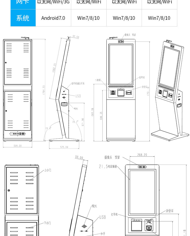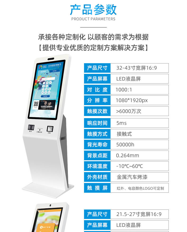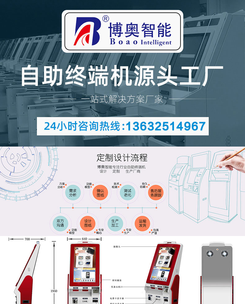 擁有專業(yè)的生產(chǎn)線,嚴(yán)格的質(zhì)量把控。耐心的咨詢服務(wù)團(tuán)隊(duì)及專業(yè)的技術(shù)負(fù)責(zé)團(tuán)體。 成產(chǎn)以“誠信、團(tuán)結(jié)、務(wù)實(shí)、創(chuàng)新”的企業(yè)精神開拓市場(chǎng)、優(yōu)化產(chǎn)品細(xì)節(jié)提供舒適的自助體驗(yàn)。公司本著“誠信為本,質(zhì)量至上”的取勝之道不斷開發(fā)自助終端在各行業(yè)的應(yīng)用,打造方便快捷的一站式服務(wù)。設(shè)備圖紙?jiān)O(shè)計(jì)-數(shù)控沖壓-折彎-焊接-刮灰打磨-磨砂清洗-噴底漆-高溫烤漆-機(jī)柜部件拼裝-配件安裝-整機(jī)調(diào)試?yán)先A測(cè)試-打包發(fā)貨;制實(shí)用的自助終端設(shè)備,我們是專業(yè)。多種定制款式任意選擇,可根據(jù)需求定制外觀屏幕尺寸可選,配件數(shù)量可選,主機(jī)配置可選。