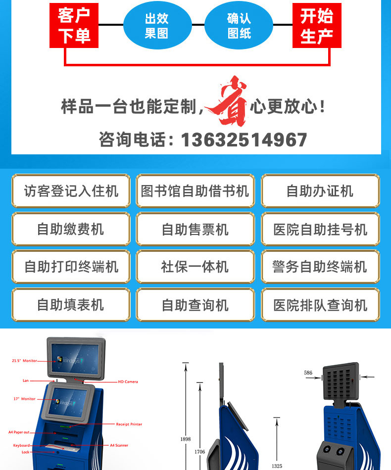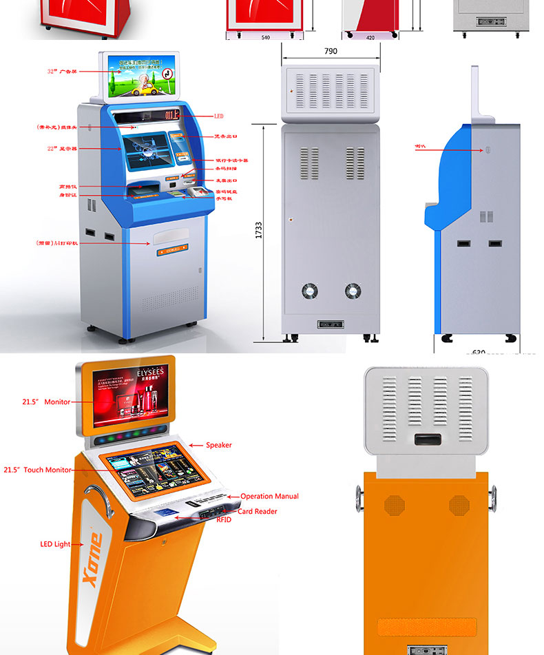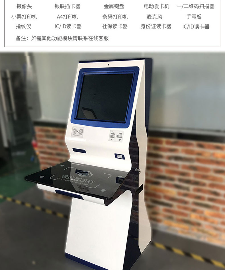 多功能自助終端一體機(jī)整機(jī)符合人體工程設(shè)計(jì),機(jī)身大氣,外形精細(xì)、新穎、美觀、簡(jiǎn)潔,觸顯一體操作、簡(jiǎn)單方便,同時(shí)具有拓展性強(qiáng)的特點(diǎn),可做為自助售書一體機(jī)、自助收銀一體機(jī)、檔案管理一體機(jī)、政務(wù)自助辦理終端、訪客登記一體機(jī)等,本設(shè)備支持Windows系統(tǒng)和Android系統(tǒng),供客戶選擇,可根據(jù)客戶需求定制外觀和功能。