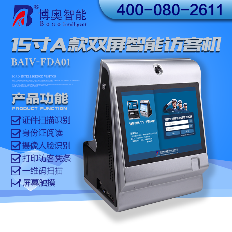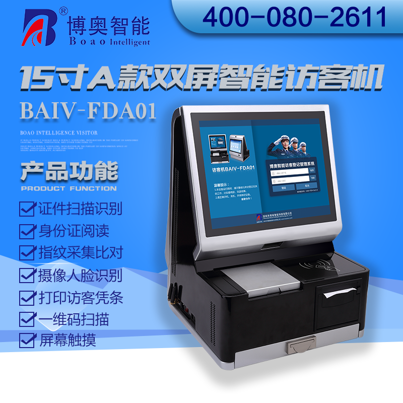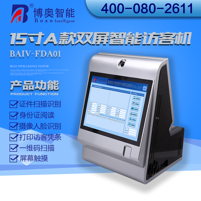 ? ? ? 15寸A款雙屏智能訪客機(jī)利用用計(jì)算機(jī)、觸摸屏手寫、證件識(shí)別(OCR),射頻識(shí)別、指紋生物識(shí)別、熱敏打印、條碼、數(shù)碼攝像、自動(dòng)制證、硬件加密、網(wǎng)絡(luò)等技術(shù)實(shí)現(xiàn)智能信息化訪客登記管理,將目前手工填寫出入登記管理、電話咨詢被訪人等傳統(tǒng)方式轉(zhuǎn)變?yōu)楦呖萍嫉挠?jì)算機(jī)化、信息數(shù)字化處理,消除了手寫登記填寫時(shí)間長(zhǎng),容易出錯(cuò),信息缺失虛假多,不易保存,信息查詢困難等種種弊端;訪客登記管理系統(tǒng)能夠準(zhǔn)確快速的對(duì)來(lái)訪人員的證件、圖像、指紋等信息進(jìn)行識(shí)別登記并保存,以便日后查詢,同時(shí)利用聯(lián)動(dòng)功能,可以對(duì)進(jìn)出車輛自動(dòng)識(shí)別登記。
