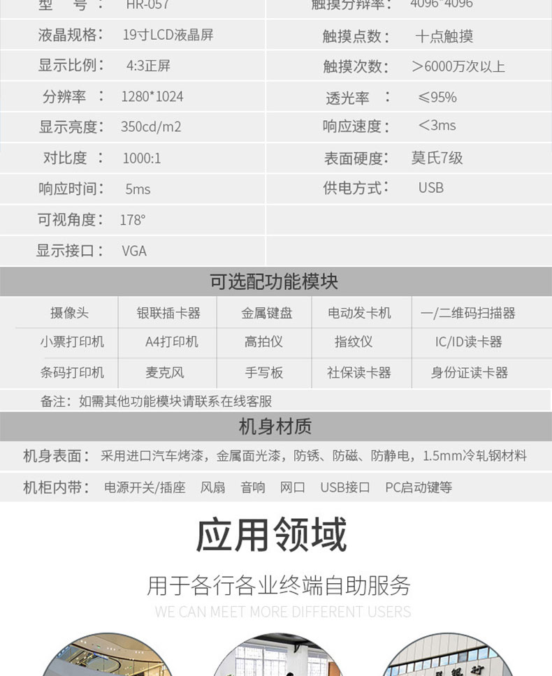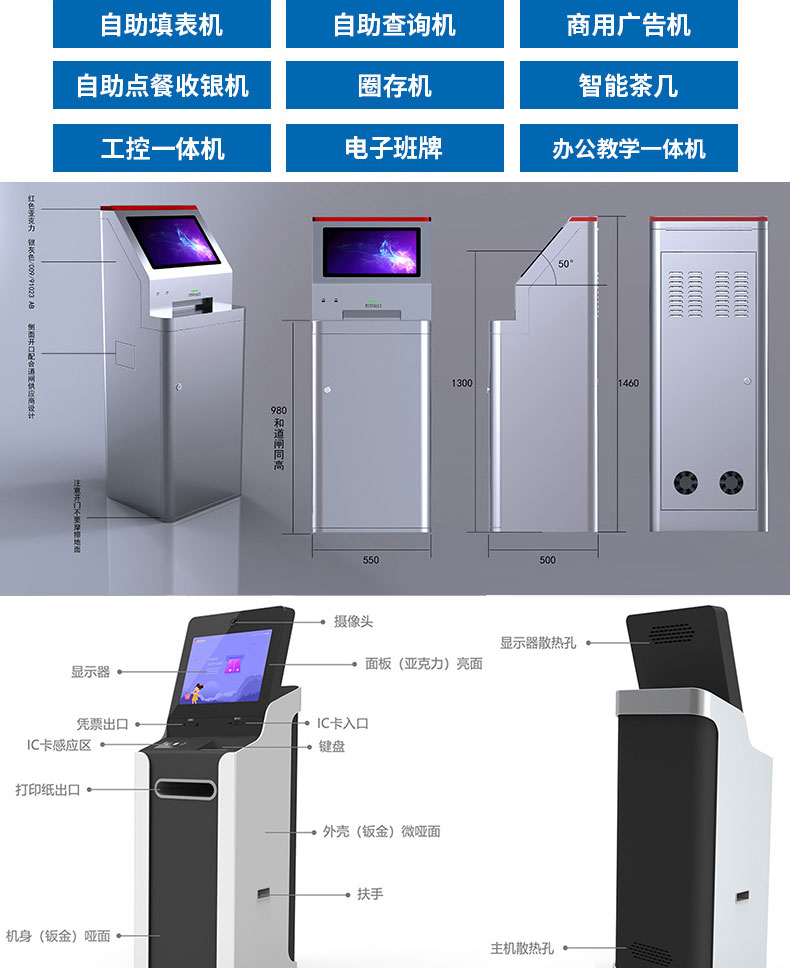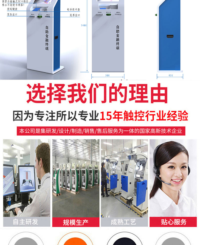 專業(yè)提供電腦觸控產(chǎn)品、自助服務(wù)終端的設(shè)計(jì)及生產(chǎn)服務(wù),主要產(chǎn)品自助終端機(jī)、自助打印機(jī)、自助取票機(jī)、自助查詢機(jī)、自助繳費(fèi)機(jī)、自助發(fā)卡機(jī)、自助政務(wù)一體機(jī),產(chǎn)品使用于各個(gè)行業(yè);醫(yī)院、學(xué)校、銀行、酒店、景區(qū)等。。。。。公司擁有專業(yè)的生產(chǎn)線,嚴(yán)格的質(zhì)量把控。耐心的咨詢服務(wù)團(tuán)隊(duì)及專業(yè)的技術(shù)負(fù)責(zé)團(tuán)體。