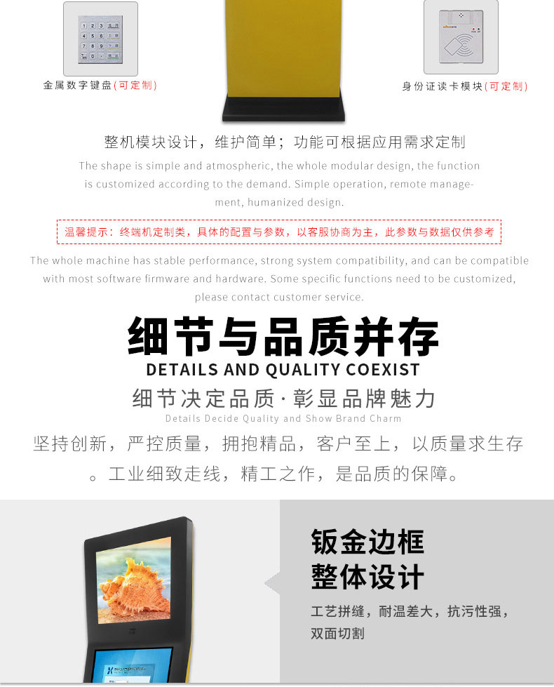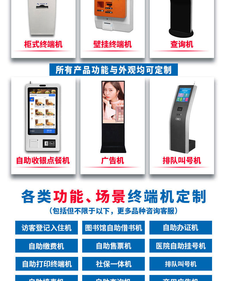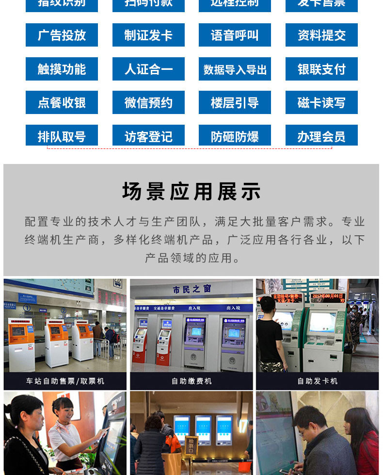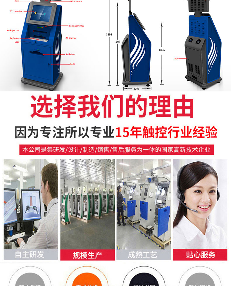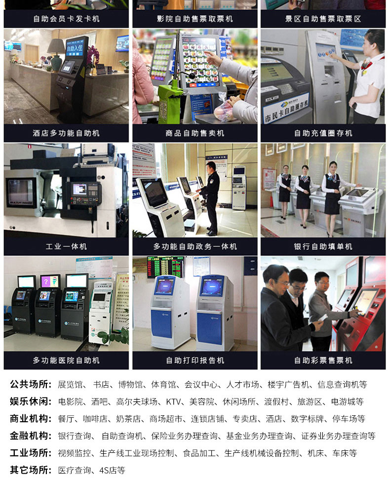 專業(yè)提供電腦觸控產(chǎn)品、自助服務(wù)終端的設(shè)計(jì)及生產(chǎn)服務(wù),主要產(chǎn)品自助終端機(jī)、自助打印機(jī)、自助取票機(jī)、自助查詢機(jī)、自助繳費(fèi)機(jī)、自助發(fā)卡機(jī)、自助政務(wù)一體機(jī),產(chǎn)品使用于各個(gè)行業(yè);醫(yī)院、學(xué)校、銀行、酒店、景區(qū)等。。。。。公司擁有專業(yè)的生產(chǎn)線,嚴(yán)格的質(zhì)量把控。耐心的咨詢服務(wù)團(tuán)隊(duì)及專業(yè)的技術(shù)負(fù)責(zé)團(tuán)體。