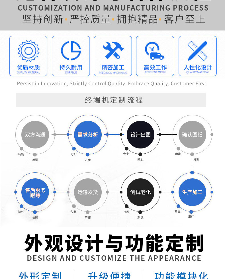 定制設(shè)備圖紙?jiān)O(shè)計(jì)-數(shù)控沖壓-折彎-焊接-刮灰打磨-磨砂清洗-噴底漆-高溫烤漆-機(jī)柜部件拼裝-配件安裝-整機(jī)調(diào)試?yán)先A測試-打包發(fā)貨。