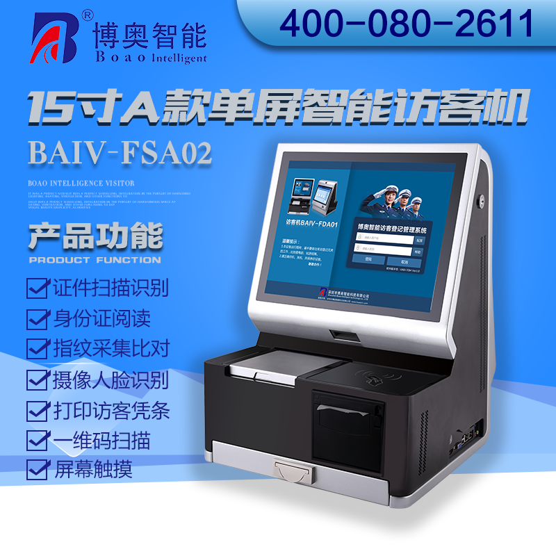 ? ? ? ?15寸A款雙屏智能訪客機利用計算機、觸摸屏手寫、證件識別(OCR),射頻識別、指紋生物識別、熱敏打印、條碼、數(shù)碼攝像、自動制證、硬件加密、網(wǎng)絡(luò)等技術(shù)實現(xiàn)智能信息化訪客登記管理,將目前手工填寫出入登記管理、電話咨詢被訪人等傳統(tǒng)方式轉(zhuǎn)變?yōu)楦呖萍嫉挠嬎銠C化、信息數(shù)字化處理,消除了手寫登記填寫時間長,容易出錯,信息缺失虛假多,不易保存,信息查詢困難等種種弊端;訪客登記管理系統(tǒng)能夠準(zhǔn)確快速的對來訪人員的證件、圖像、指紋等信息進行識別登記并保存,以便日后查詢,同時利用聯(lián)動功能,可以對進出車輛自動識別登記。