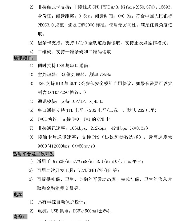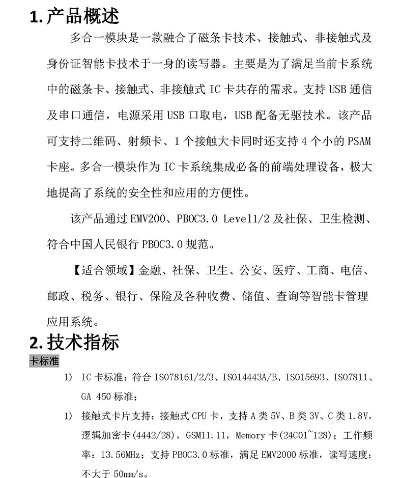 多合一模塊是一款融合了磁條卡技術(shù)、接觸式、非接觸式及身份證智能卡技術(shù)于一身的讀寫器。主要是為了滿足當前卡系統(tǒng)中的磁條卡、接觸式、非接觸式 IC 卡共存的需求。支持 USB 通信及串口通信,電源采用 USB 口取電,USB 配備無驅(qū)技術(shù)。該產(chǎn)品可支持二維碼、射頻卡、1 個接觸大卡同時還支持 4 個小的 PSAM 卡座。多合一模塊作為 IC 卡系統(tǒng)集成必備的前端處理設(shè)備,極大地提高了系統(tǒng)的安全性和應用的方便性。 該產(chǎn)品通過 EMV200PBOC3.0 Level1/2 及社保、衛(wèi)生檢測、符合中國人民銀行 PBOC3.0 規(guī)范。