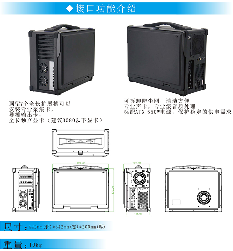 廣電影視導(dǎo)播直播錄播系統(tǒng)一體計(jì)算機(jī)工業(yè)級(jí)加固防振室外高亮便攜式17.3寸工控電腦支持定制加工國(guó)產(chǎn)系統(tǒng),采用鋁鎂合外殼,體積輕巧,性能穩(wěn)定,方便攜帶等特點(diǎn);集成導(dǎo)播鍵盤(pán)、音頻模塊、視頻加速卡、導(dǎo)播輸出卡、17.3寸高亮屏,保證戶外使用也清晰可見(jiàn),用于廣電行業(yè)和教育行業(yè)的專業(yè)級(jí)導(dǎo)播/直播便攜設(shè)備。