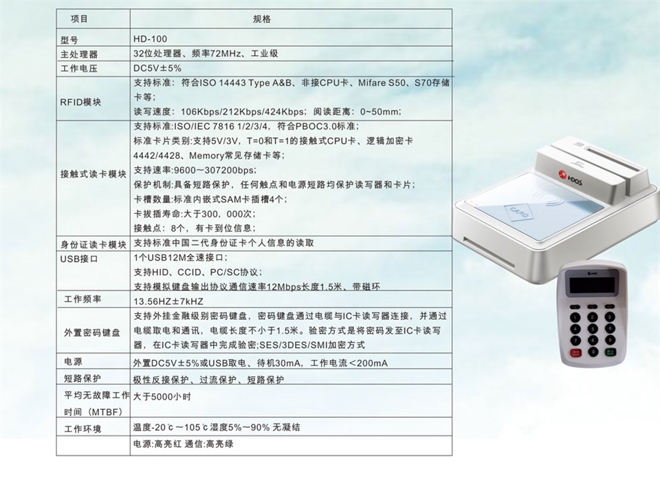 產品采用 RFID技術,可支持社保卡、二代證、一代證的讀取和寫入;支持金融 IC卡讀寫;支持銀聯(lián)在線支付;可用于身份識別和驗證;可應用于金融領域、交通領域、社保領域、一卡通領域等。
