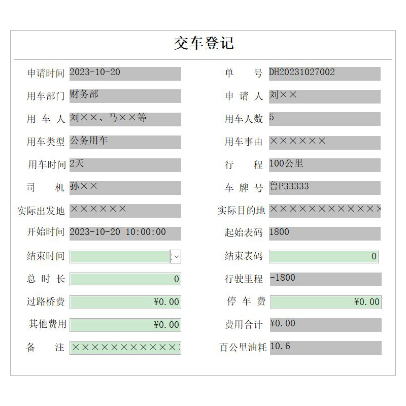 1、基本信息(用車部門、維修單位、年審單位、保險(xiǎn)公司、油規(guī)格、車輛類型、車輛品牌、顏色、用途、本單位信息);