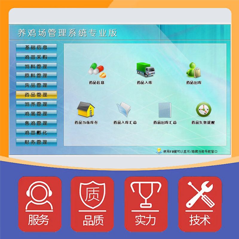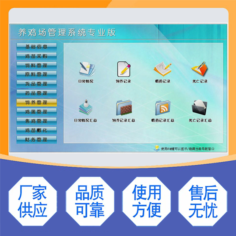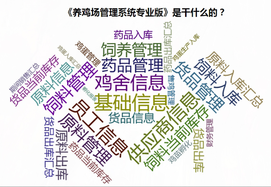 《養(yǎng)雞場管理系統(tǒng)專業(yè)版》是一款適用于中小型養(yǎng)雞場的管理軟件。主要包含基礎(chǔ)信息、雞苗采購、飼料管理、原料管理、貨品管理、藥品管理、飼養(yǎng)管理、雞蛋管理等功能。本管理系統(tǒng)多處具有快速輔助錄入功能,操作簡單,易學(xué)、易用;處理功能高效強(qiáng)大,是協(xié)助您的好幫手!
