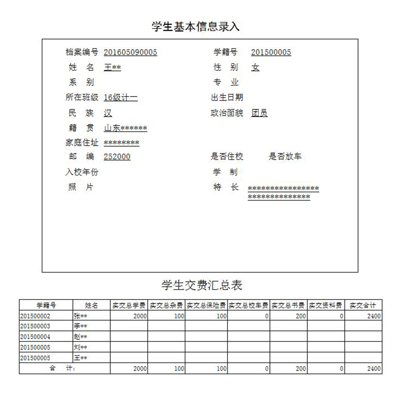 統(tǒng)計查詢則包括學生交費匯總、班級每學期交費統(tǒng)計、費用匯總和欠費學生名單